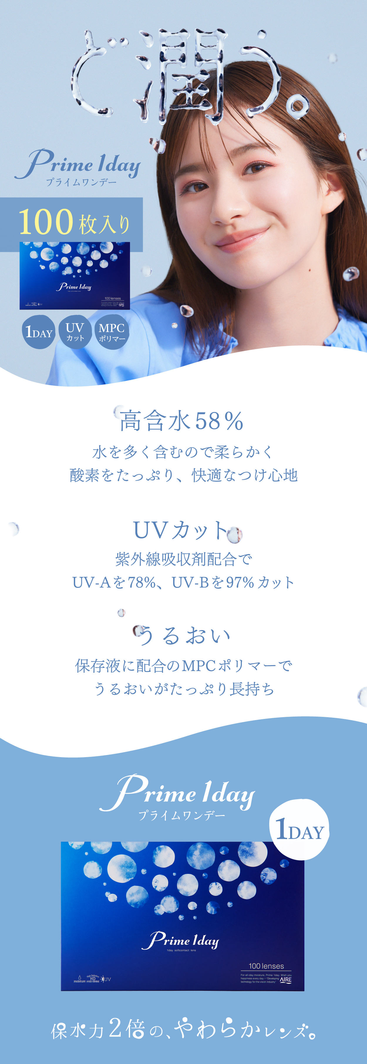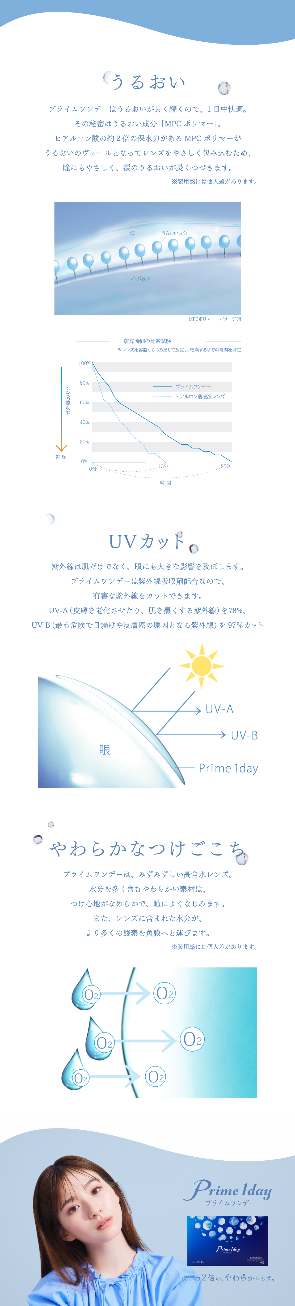クリアで、清々しく、やさしく潤う”をコンセプトとして、潤い成分MPCポリマー配合で従来商品より2倍の保水力。水を多く含む柔らかい素材で快適なつけ心地。酸素透過性が高いので眼の健康にもやさしいレンズです。UV吸収剤を配合。紫外線からも眼を守ります。