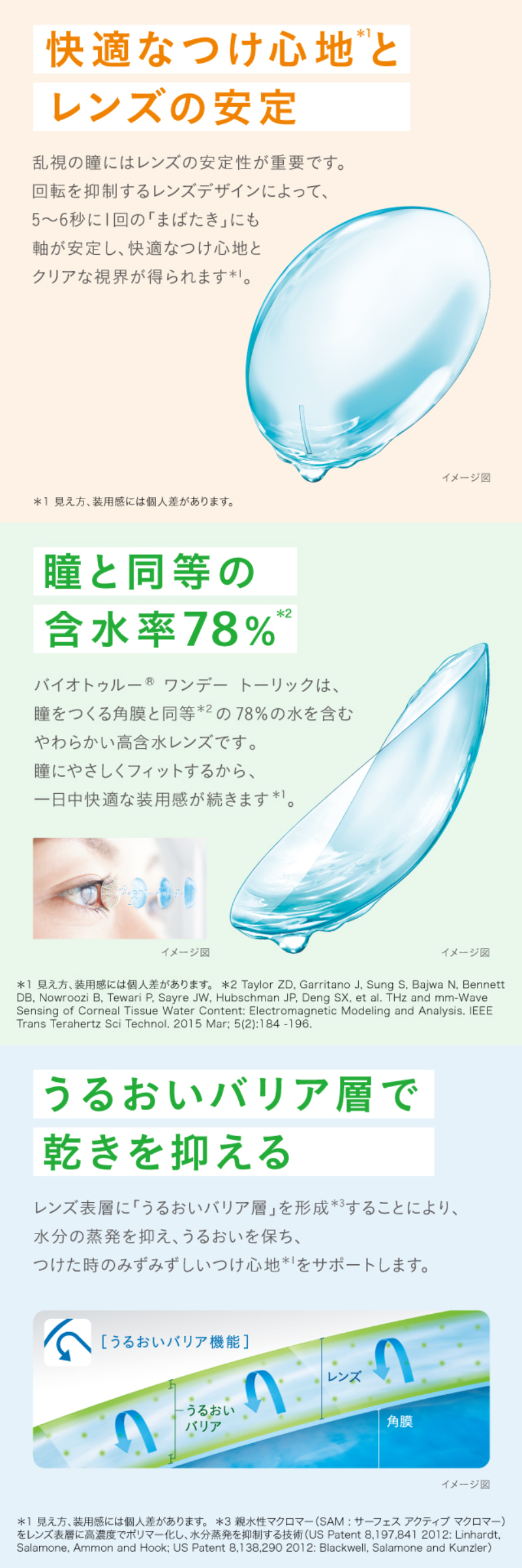 角膜乱視にフィットしやすい「バックトーリック」で乱視を補正し、「非球面設計」で球面収差を補正。