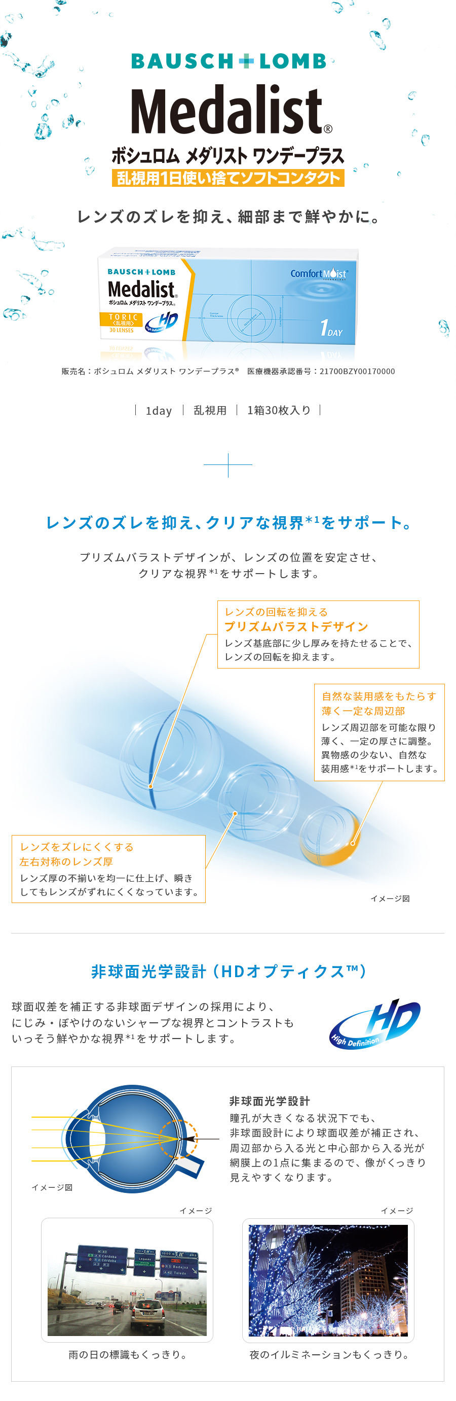 「メダリスト ワンデープラス 乱視用」は、通常の球面デザインレンズでは、レンズに入ってくる平行線を一点に集束しにくい欠点がありました。それに対し、非球面レンズデザインの「メダリスト ワンデープラス 乱視用」は、像ボケのない、輪郭や細部まで鮮明でシャープな視界を実現します。
