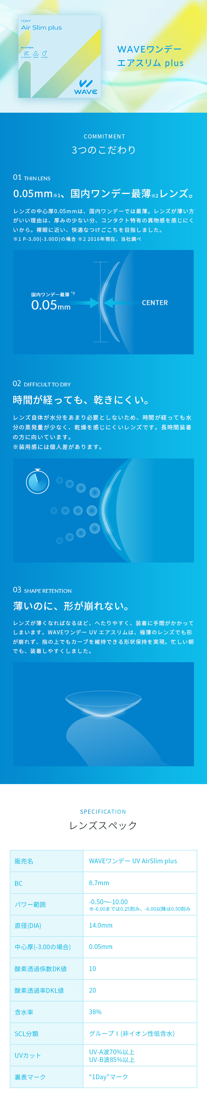 WAVEワンデー エアスリム plusは、長時間の装用を考えたバランス型の低含水コンタクトレンズです。