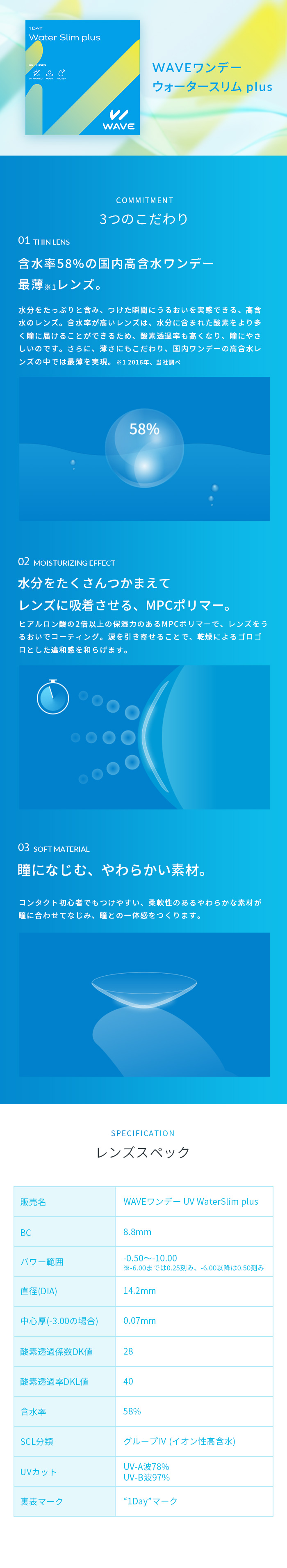 WAVEワンデー ウォータースリム plusは、酸素透過性が高いので目の健康にもやさしいレンズです。
