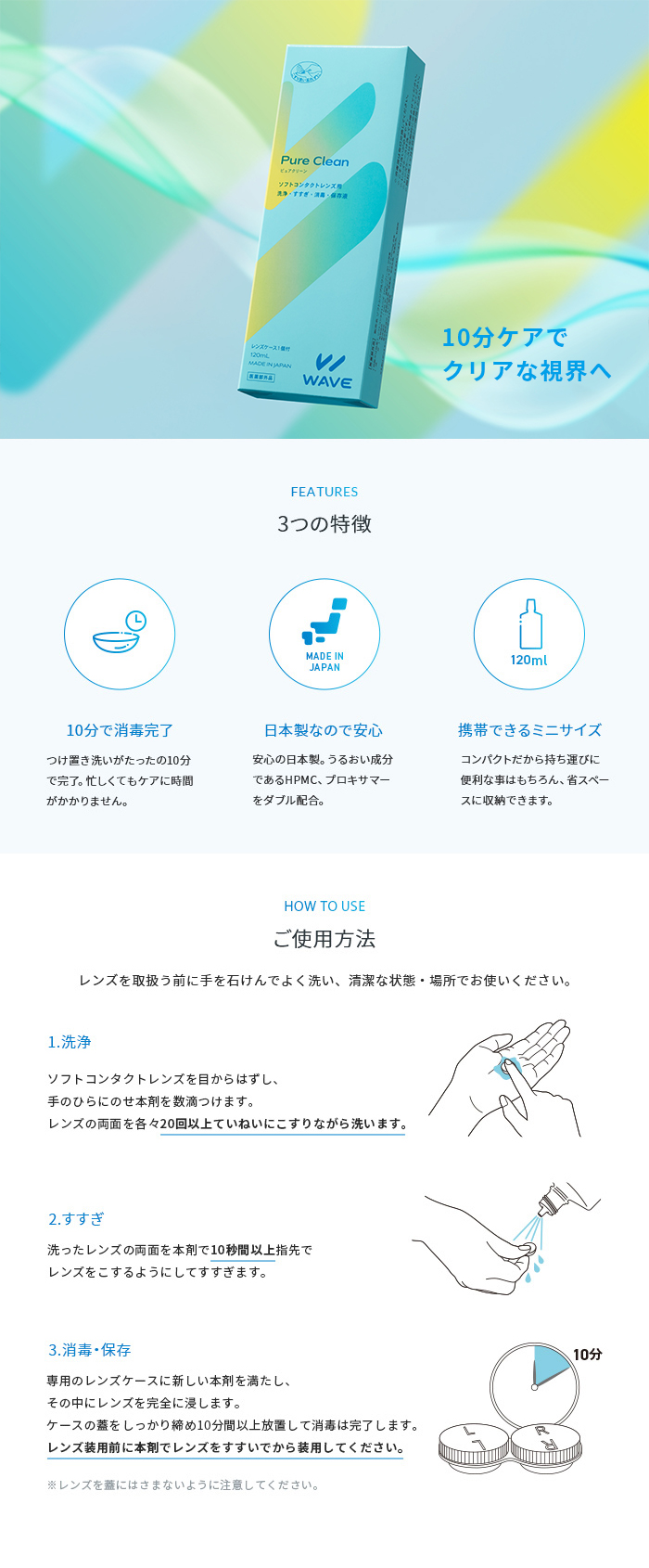 WAVEシリーズからコンタクトレンズ洗浄液が登場!ソフトコンタクトレンズ・カラーコンタクトレンズの洗浄・すすぎ・消毒・保存、1本で簡単ケア。消毒完了までたったの10分!ダブルのうるおい成分配合でレンズの乾燥を防ぎ、快適な装用感を保ちます。