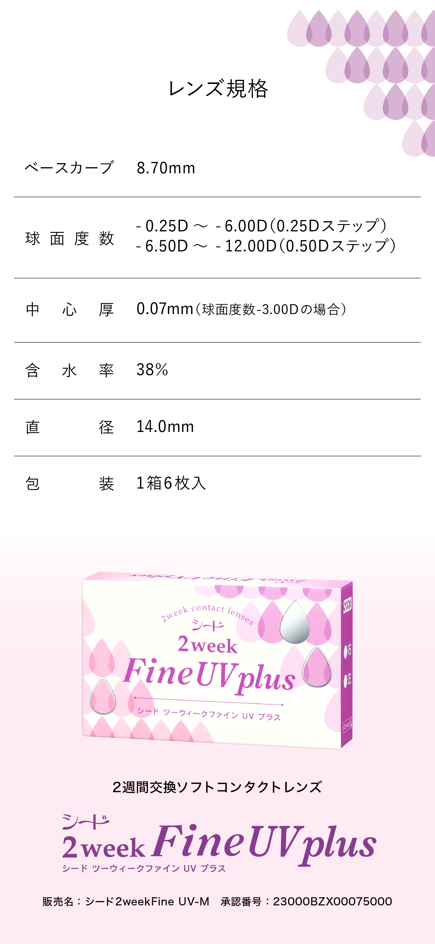 「2WEEK Fine UV」が、「2WEEK Fine UV plus」にリニューアル!レンズ保存液に天然保湿成分のアルギン酸をプラス。たっぷりうるおう、ずっとうるおう、こだわりの保水力を実現しました。