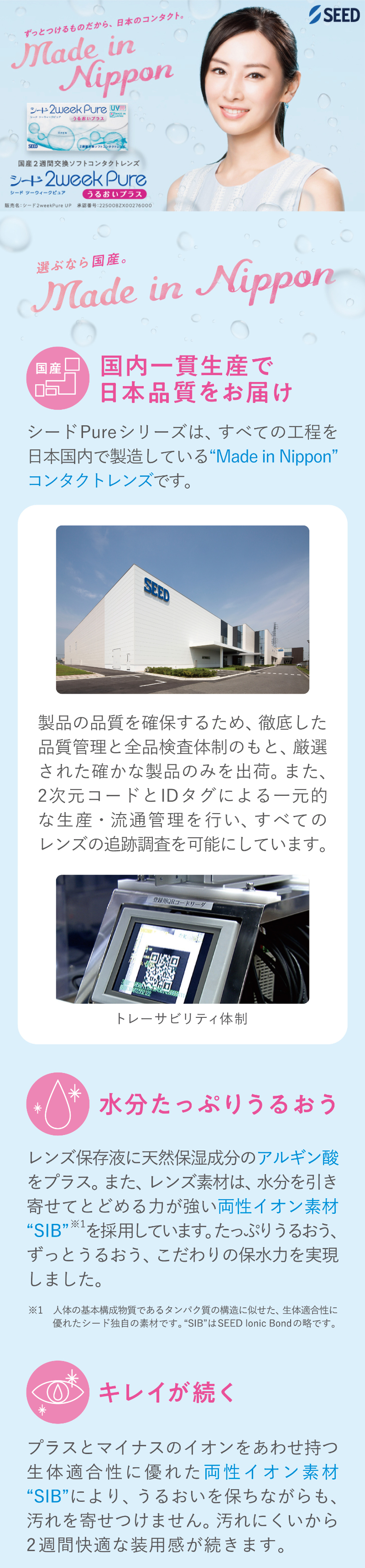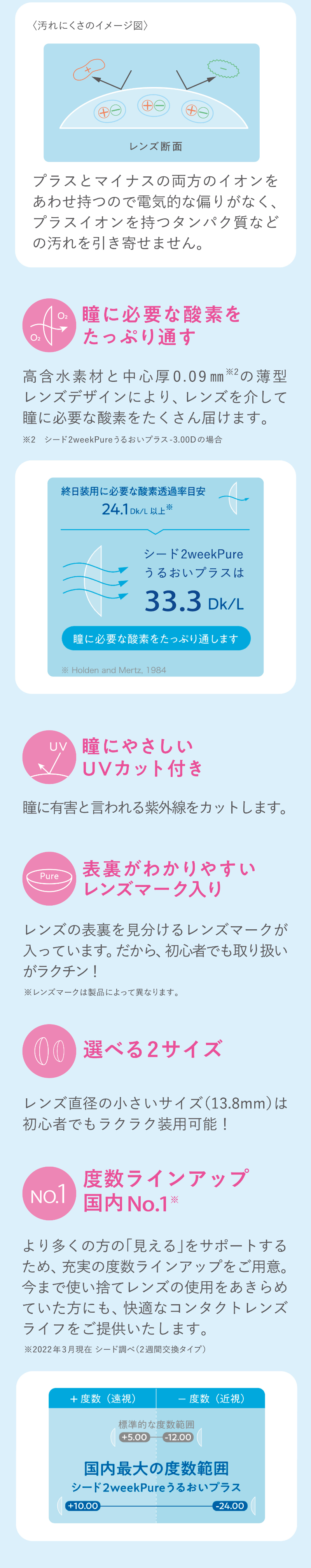 国産、UVカット、汚れにくさが特長で、うるおいが続く2週間交換レンズです。
